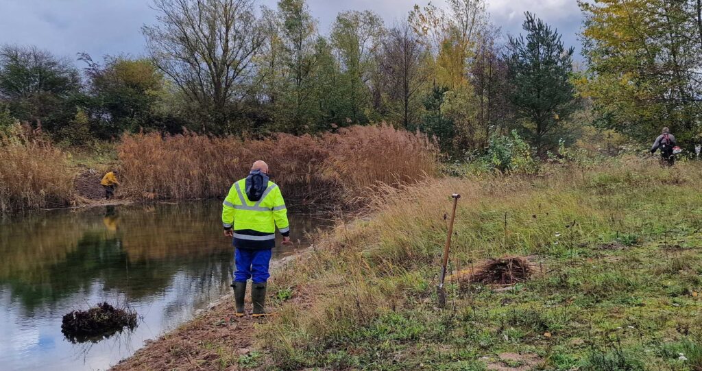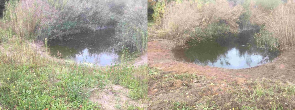 Bei zu Beginn regnerischem aber dann auflockerndem Wetter, haben wir am Samstag, den 25.10.2025, unsere Hauptaktion am Karlsdorfer Baggersee durchgeführt. An beiden Teichen, an welchen die Westliche Dornschrecke vorkommt, haben wir an den Südufern die Gehölze entfernt, damit die Westliche Dornschrecke im kommenden Jahr wieder ihren erforderlichen Lebensraum hat (offene, wurzelfreie und unbeschattete Sandufer). Die Gehölze auf der Ostseite der beiden Teiche haben wir mit Freischneider heruntergeschnitten, das Gehölz an der Nordostseite des südlichen Teils haben wir ebenfalls heruntergeschnitten und dort wo es möglich war, die Wurzeln entfernt. An einem kurzen Teilstück am Nordufer des nördlichen Teichs haben wir wieder ein kurzes Stück offenen und freien Uferbereich hergestellt, wie er vor zwei Jahren schon mal vorhanden war, inzwischen jedoch zugewachsen ist.