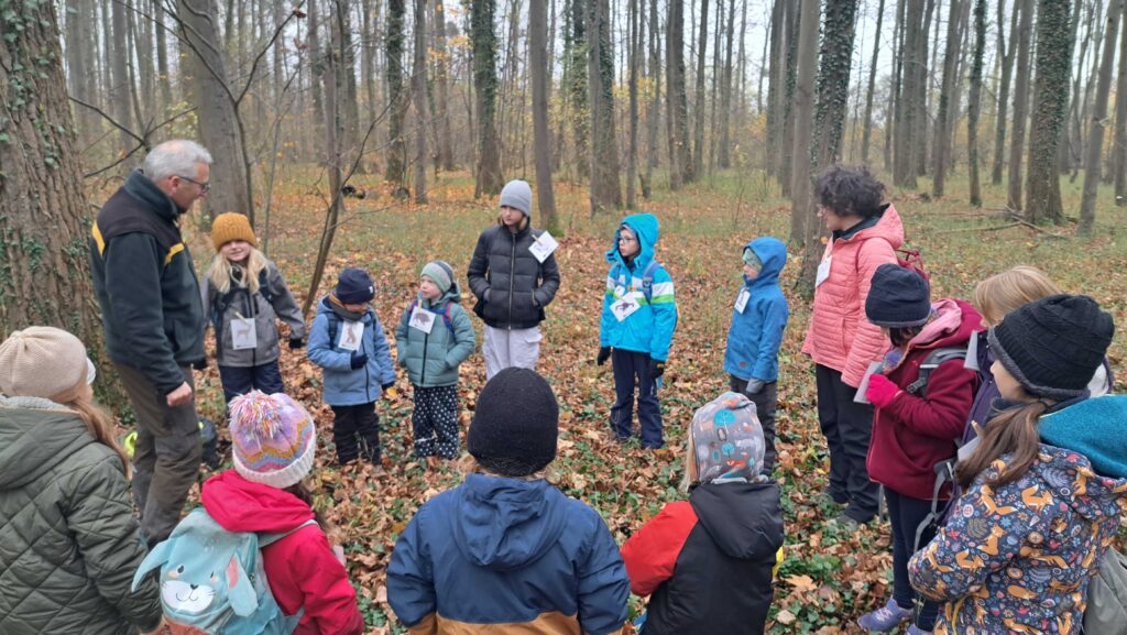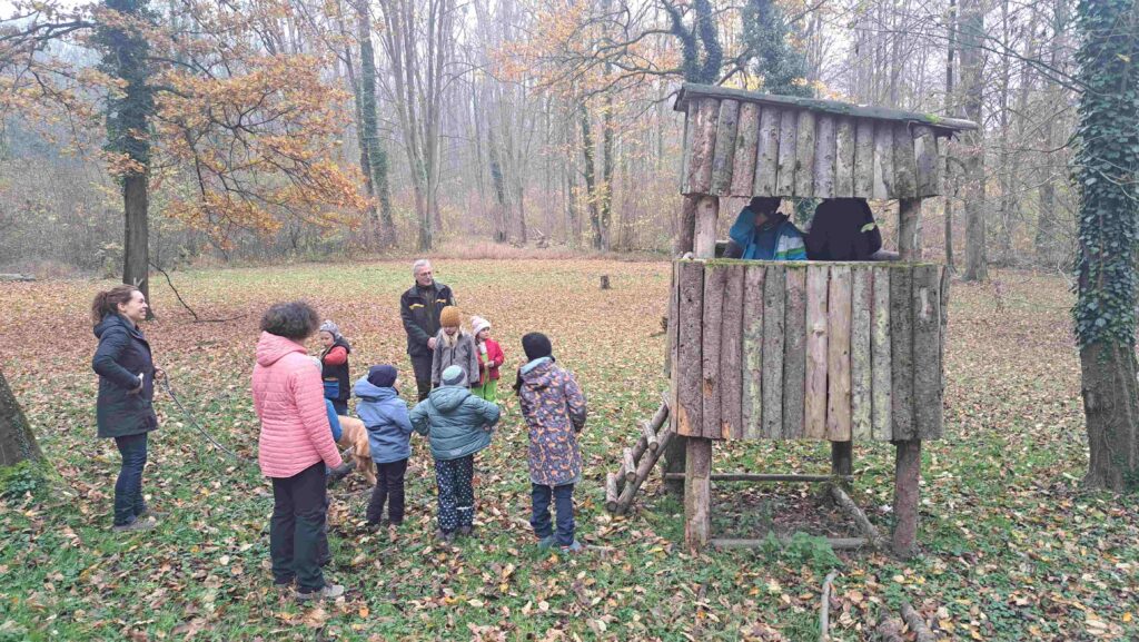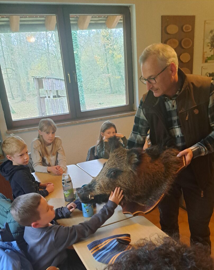 Am Samstag, den 08.11.2025, war es endlich soweit. Der lang ersehnte Besuch im Waldklassenzimmer stand an. Schon sehr gespannt und warm angezogen versammelten sich alle am vereinbarten Treffpunkt am Bootshaus in Huttenheim. Revierförster Herr Hautz erwartete uns bereits und wir starteten nach einer kurzen Begrüßung und unserem traditionellen Wolfsgeheul Richtung Wald. Unterwegs lernten wir, warum sich Blätter im Herbst färben und wie es aussieht, wenn Bäume den Blättern nach und nach die grüne Farbe entziehen. An der nächsten Station erwarteten uns verschiedene Tierkarten im Wald, von denen sich jedes Kind eine suchen durfte. Jeder konnte nun sein gesuchtes Tier vorstellen und den anderen erzählen was er über dieses Tier wusste. Von der kleinen Ameise bis zum Reh waren verschiedenste Waldbewohner vorhanden. Alle hatten etwas zu erzählen, hier und da ergänzt durch spannende Informationen vom Förster. Auf unserem weiteren Weg entdeckten wir sogar aufgewühlte Stellen auf dem Waldboden. Wie uns Herr Hautz erklärte, handelte es sich hierbei um Schlafplätze von Rehen.